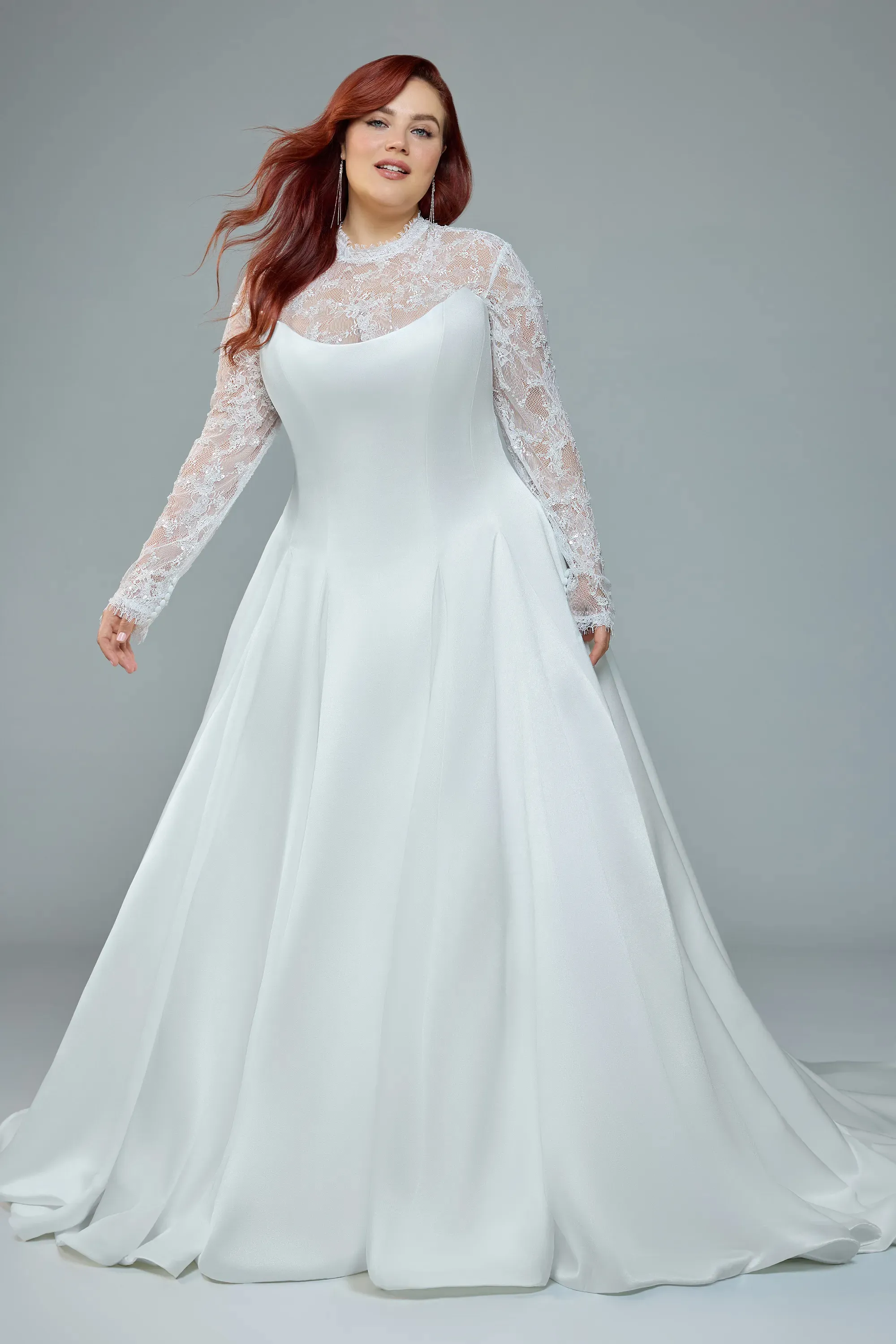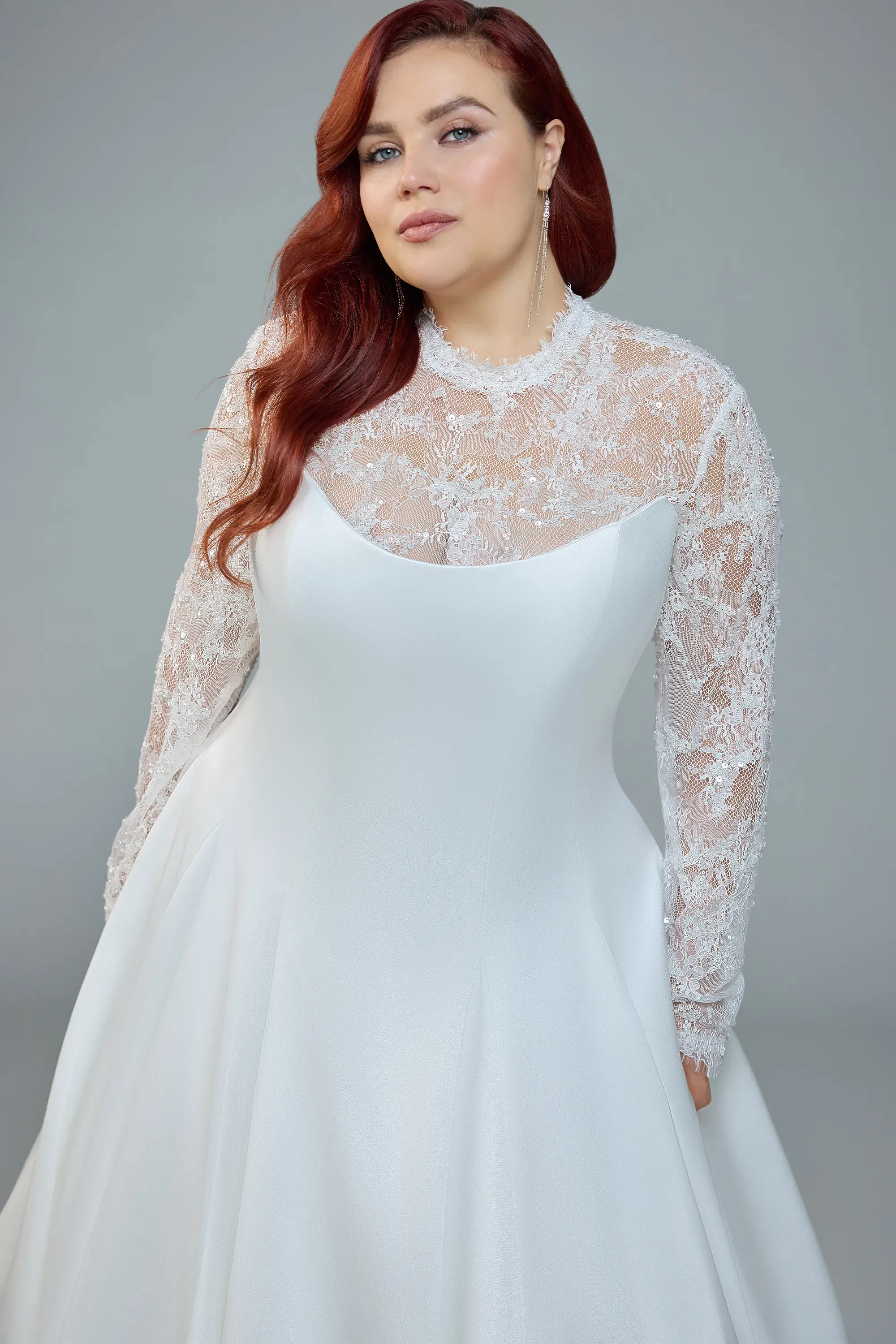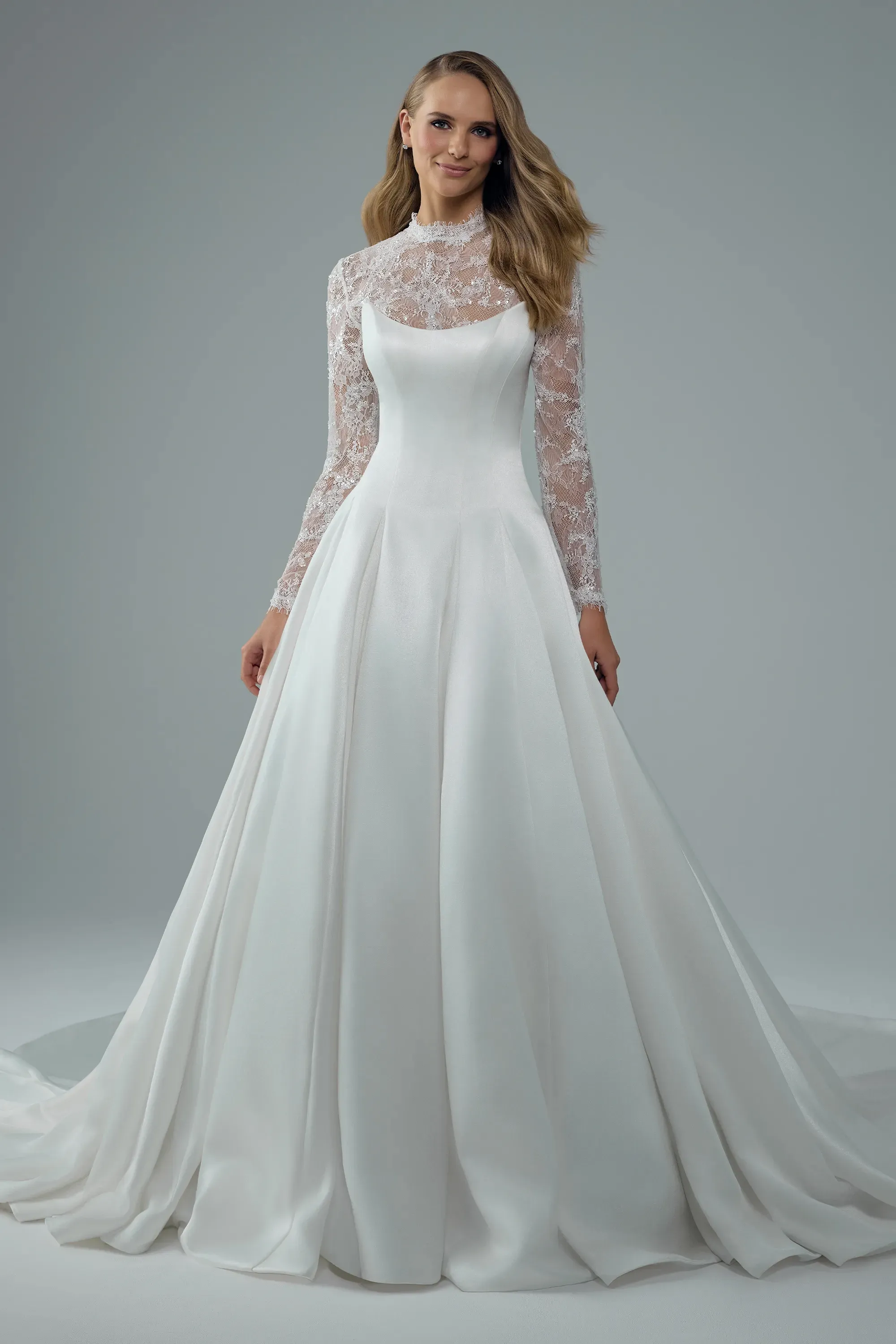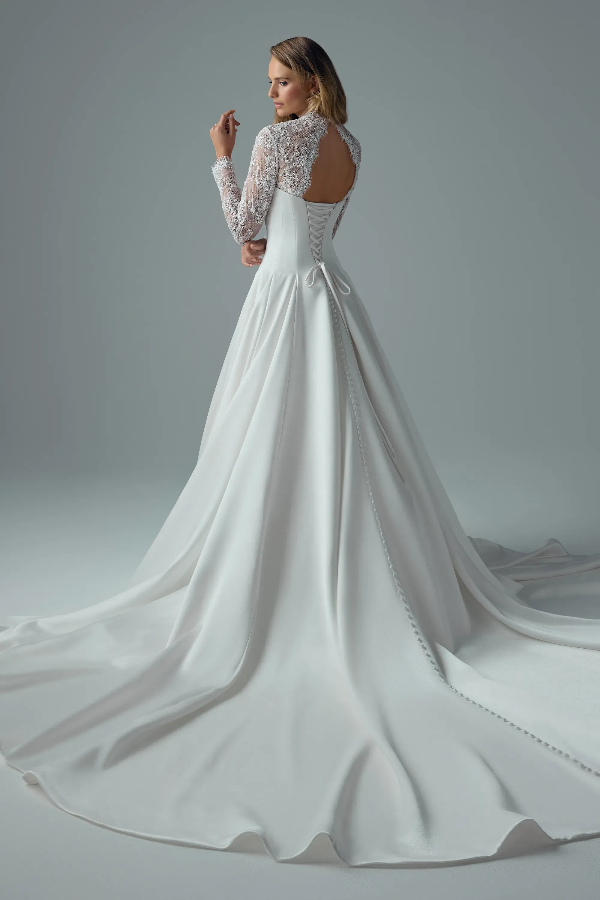 Xanthe channels ultimate vintage vibes with a unique modern edge. Cut from lustrous satin mikado, her strapless scoop bodice stays impeccably clean, drawn tight by a lace-up back that sculpts the waist. Slip on Xanthe's detachable over-lace jacket and let vintage floral lace frame the shoulders, opening into a dramatic keyhole across the back. Remove her jacket and the silhouette shifts to timeless, minimalist edge. Her princess skirt drops straight from her fitted bodice, with generous volume providing a hint of drama. Say yes to Xanthe and unlock your inner princess!