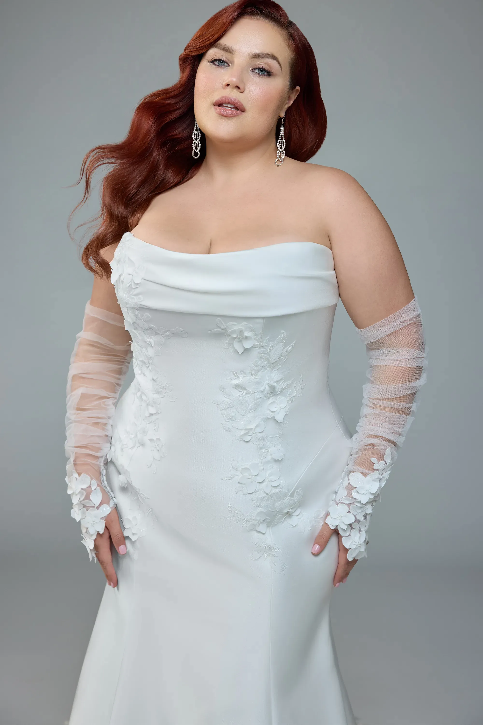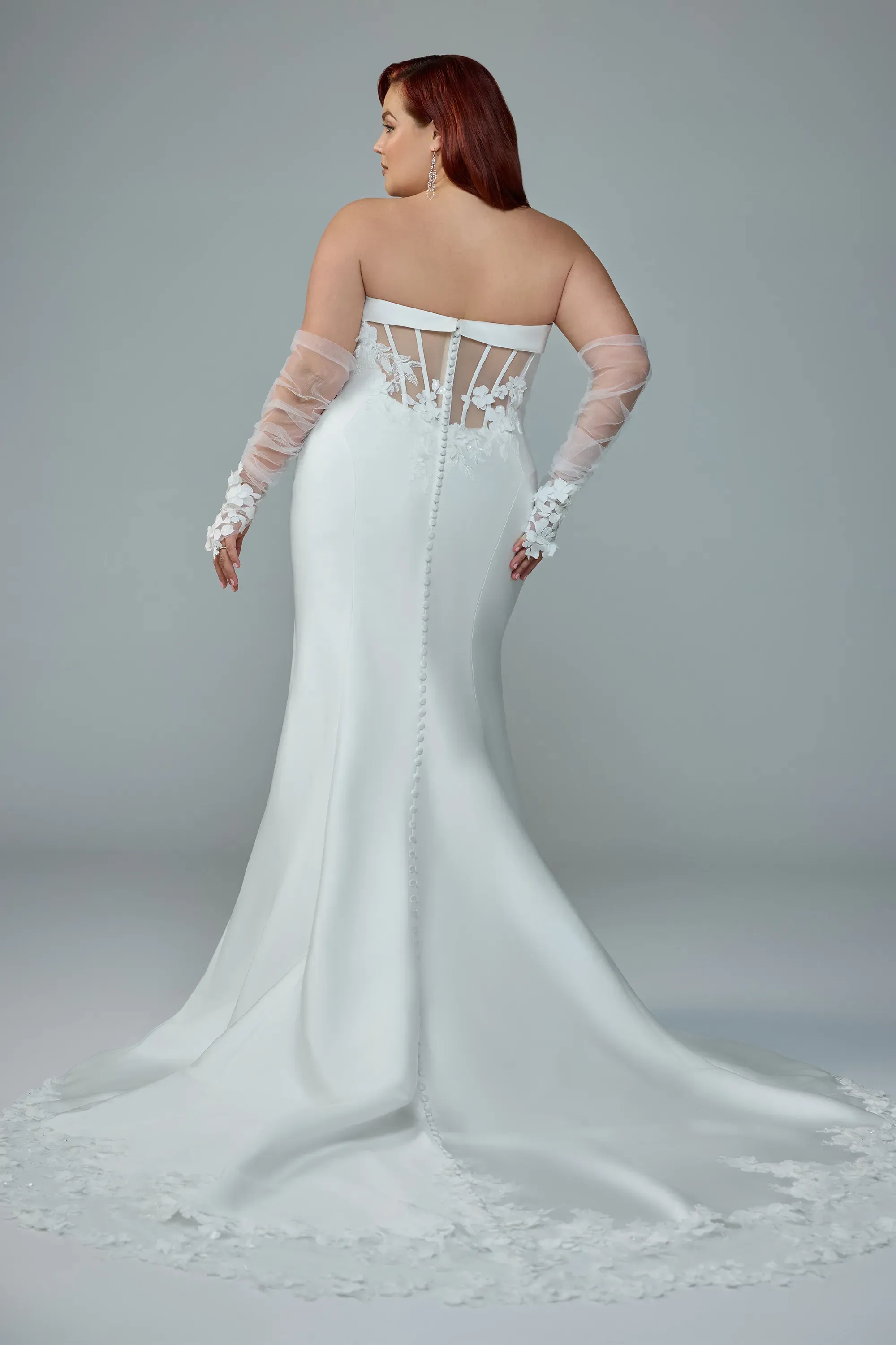 Selene is where simplicity meets refined detail. Crafted from luxurious mikado, this strapless fit-and-flare gown features a straight neckline framed by an elegantly draped band that adds soft structure to the bodice. Asymmetrical floral lace appliqués and 3D lace adorn each side of the bodice, bringing subtle texture and femininity to Selene's modern silhouette. The back bodice showcases illusion boning beneath carefully placed lace for an ethereal touch. Her sleek skirt extends into a dramatic laser-cut train, offering a crisp, contemporary finish. Selene comes with romantic, dainty, tulle gloves adorned with floral lace along the hands, a perfect blend of elegance and edge. Selene is destined to leave each and every one of your guests in absolute awe!
