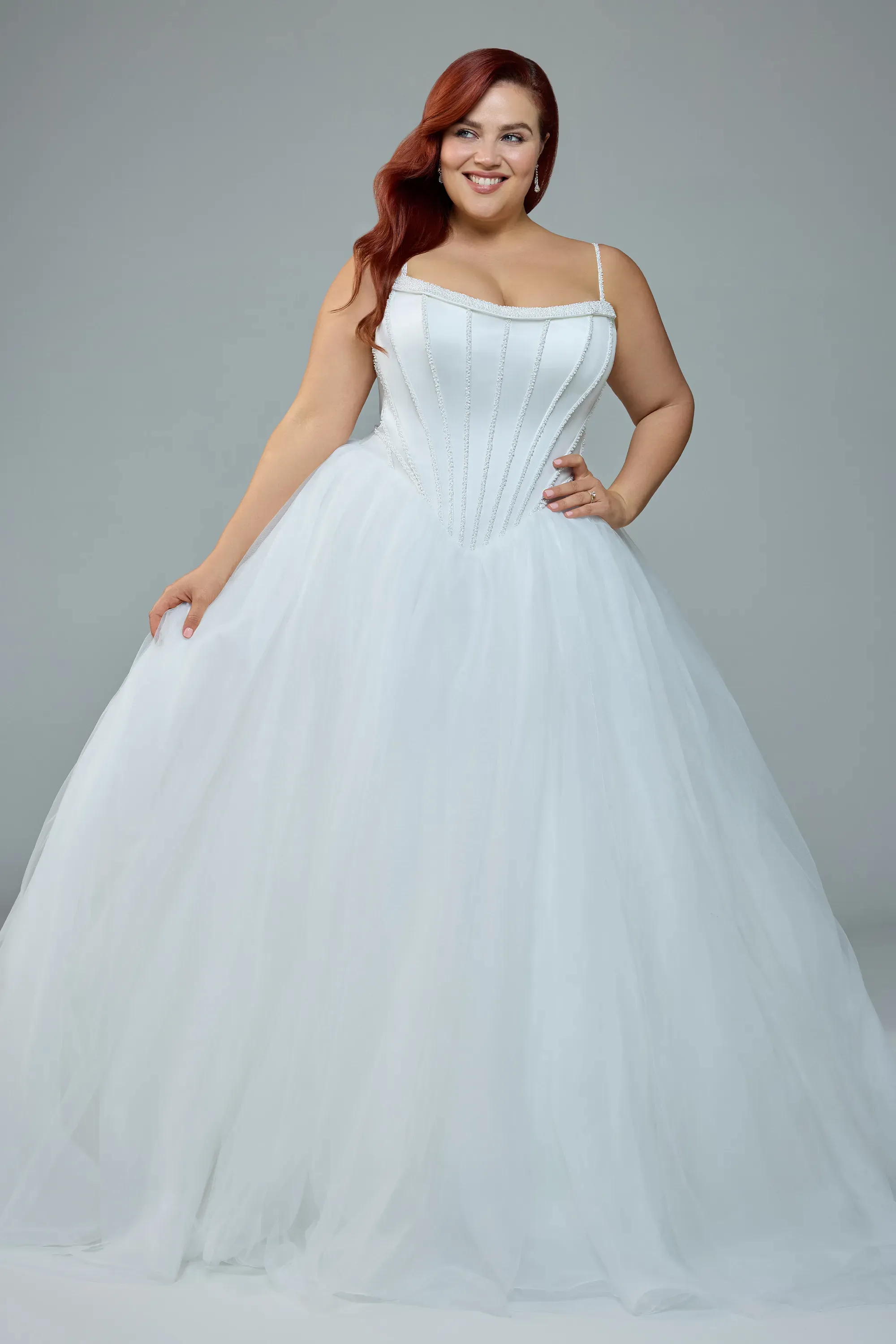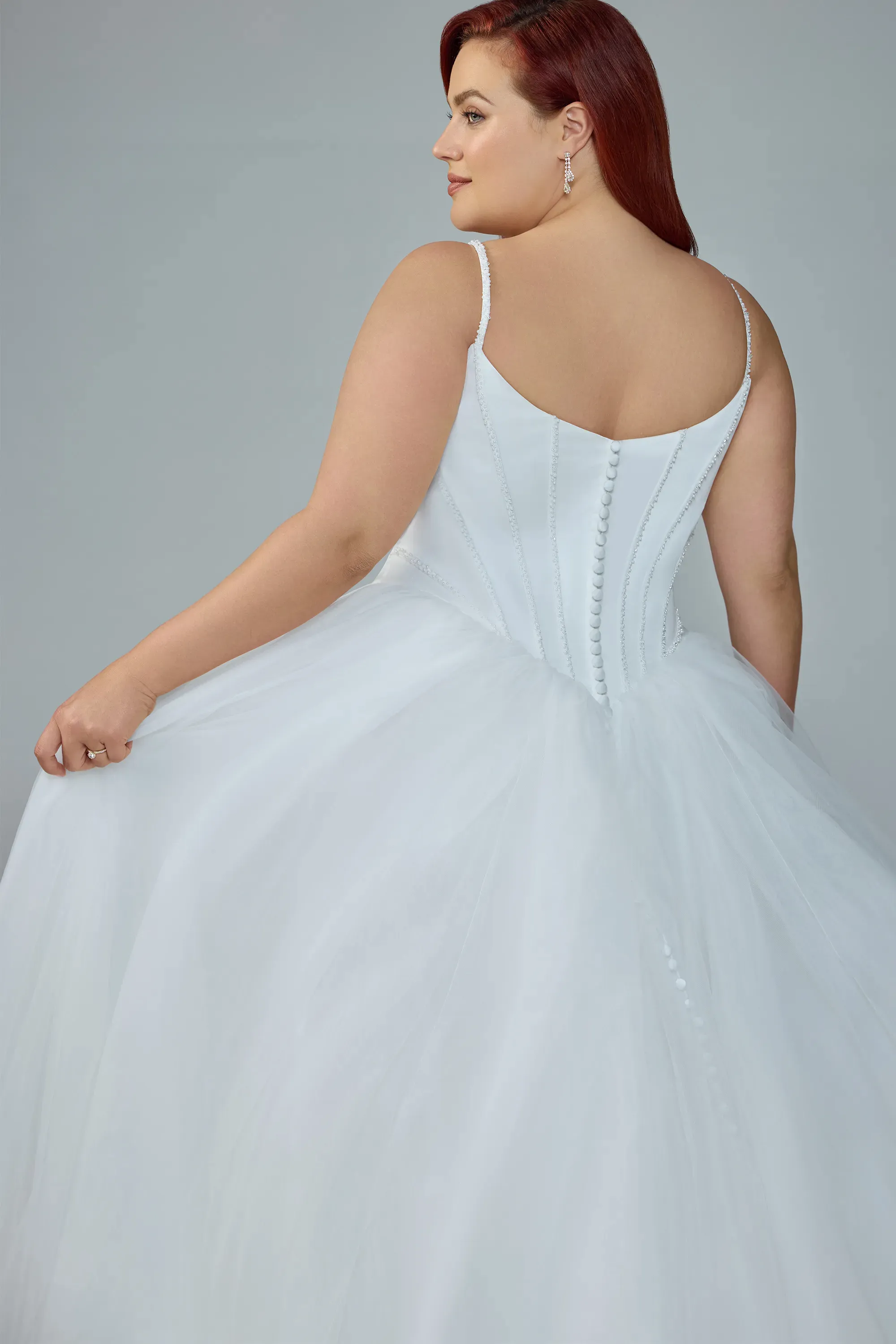 All eyes will be on you the moment Amalia enters the room. Amalia features a satin bodice with a scoop neckline that is elevated by delicate beaded spaghetti straps, beaded boning detail, and a sparkling beaded panel that traces the neckline. Her full ballgown skirt, crafted from layers of soft tulle and organza, floats with effortless grandeur. Equal parts princess and modern-day muse, Amalia is designed for the bride who wants to feel truly unforgettable.